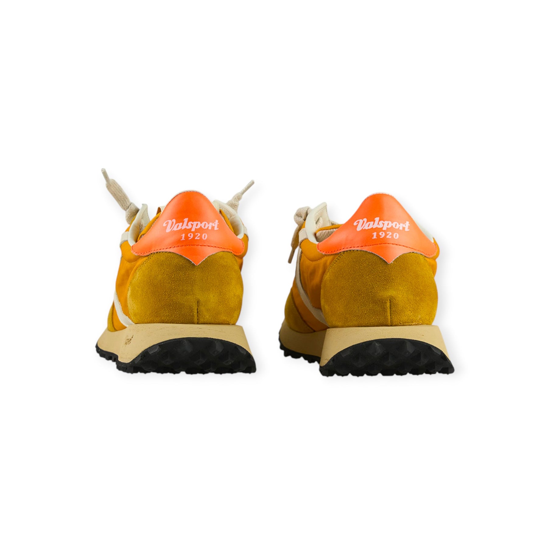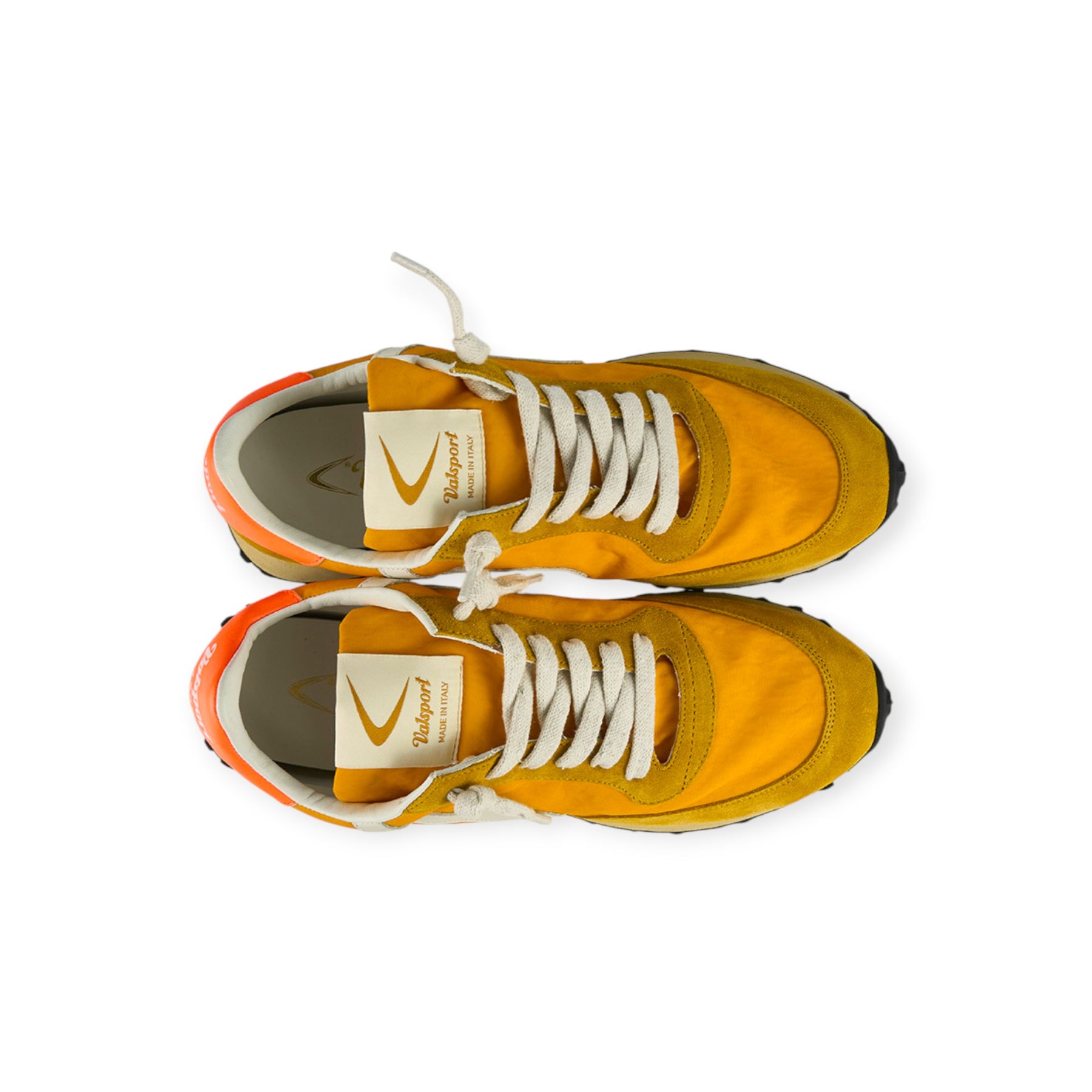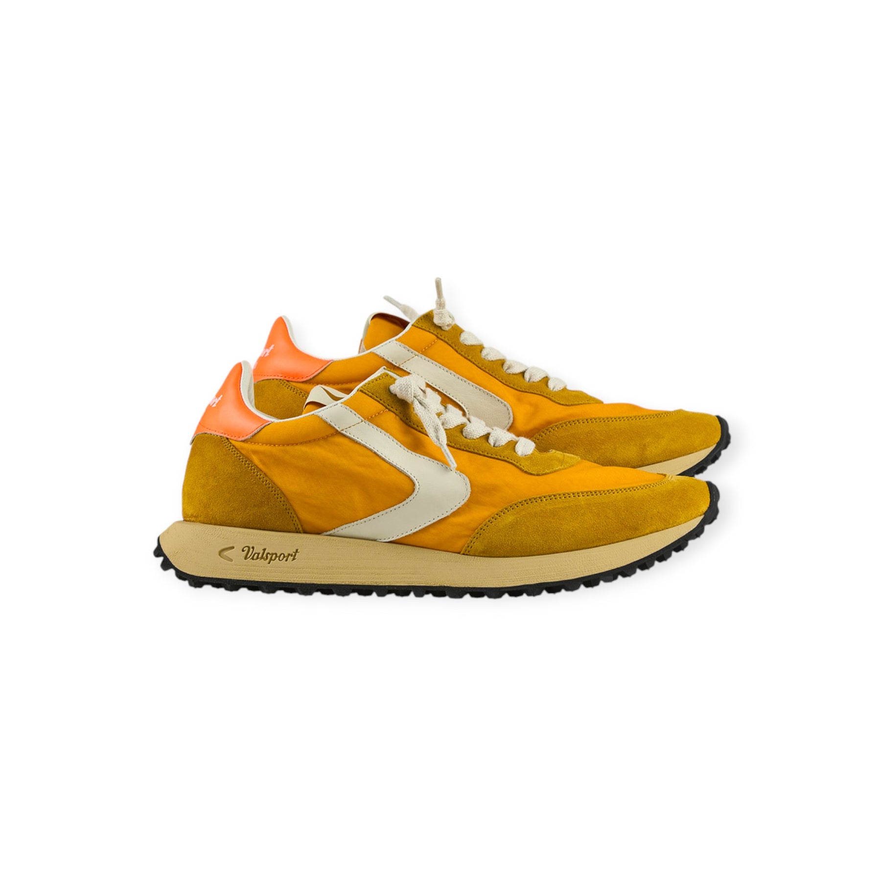 Running START HERITAGE arancio di VALSPORT in camoscio con tomaia in tessuto in tinta, boomerang in pelle beige, talloncino posteriore in arancio fluo. Fondo in gomma.
